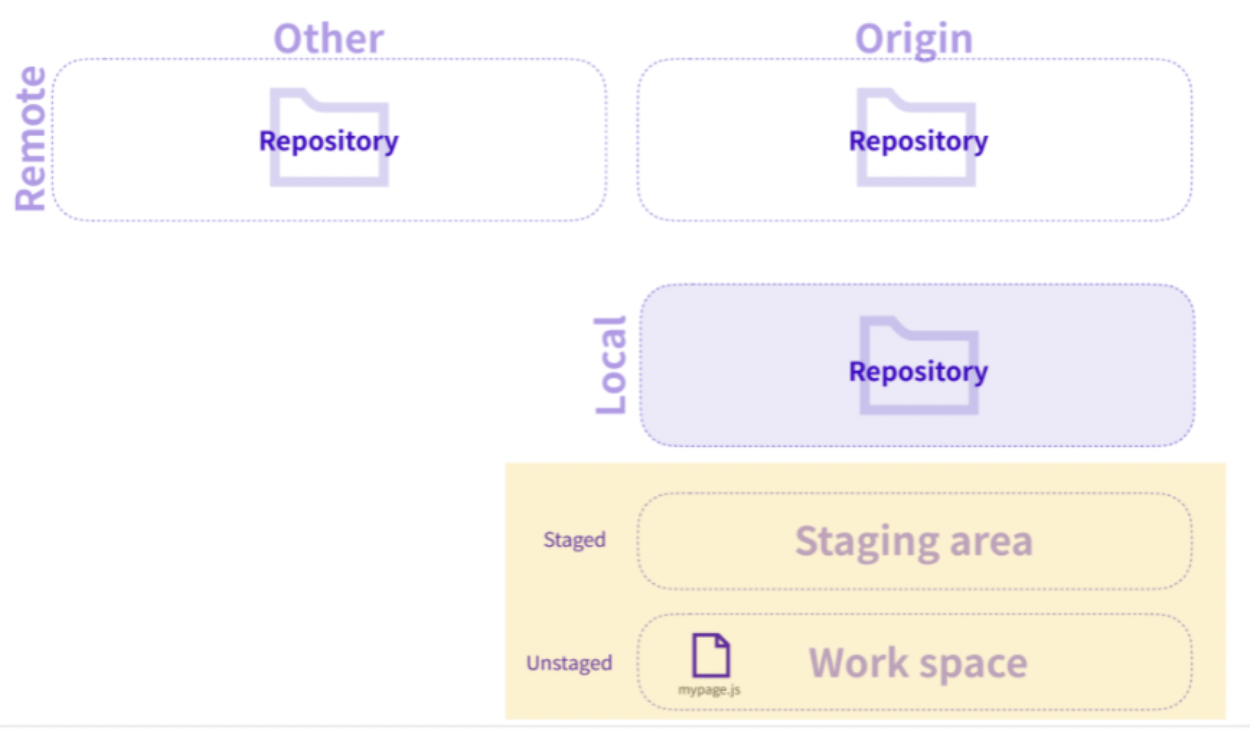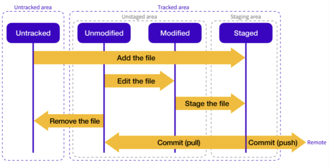 - Staged : commit 이 가능한 상태이다. 수정한 파일을 commit 하기 위해서는 staged area에 add 하는 작업이 필요하다.