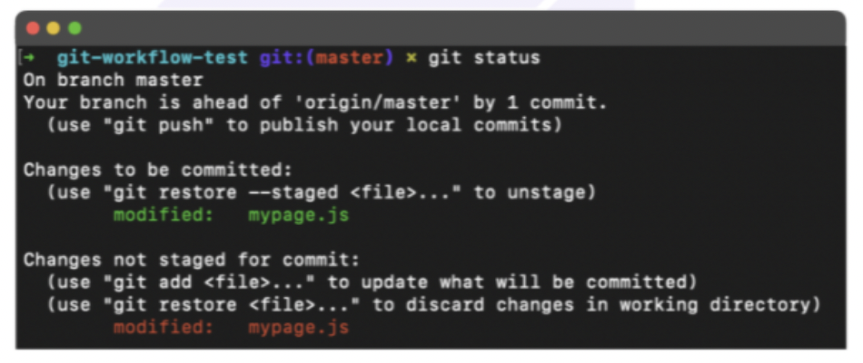 위 그림을 통해 위 터미널 내용을 다시 복습해 보자. Changes to be committed 라고 적혀 있는 초록색 파일은 staged 상태의 파일이며 Changes not staged for commit 이라고 적혀 있는 빨간색 파일은 Modified 상태의 파일이다.